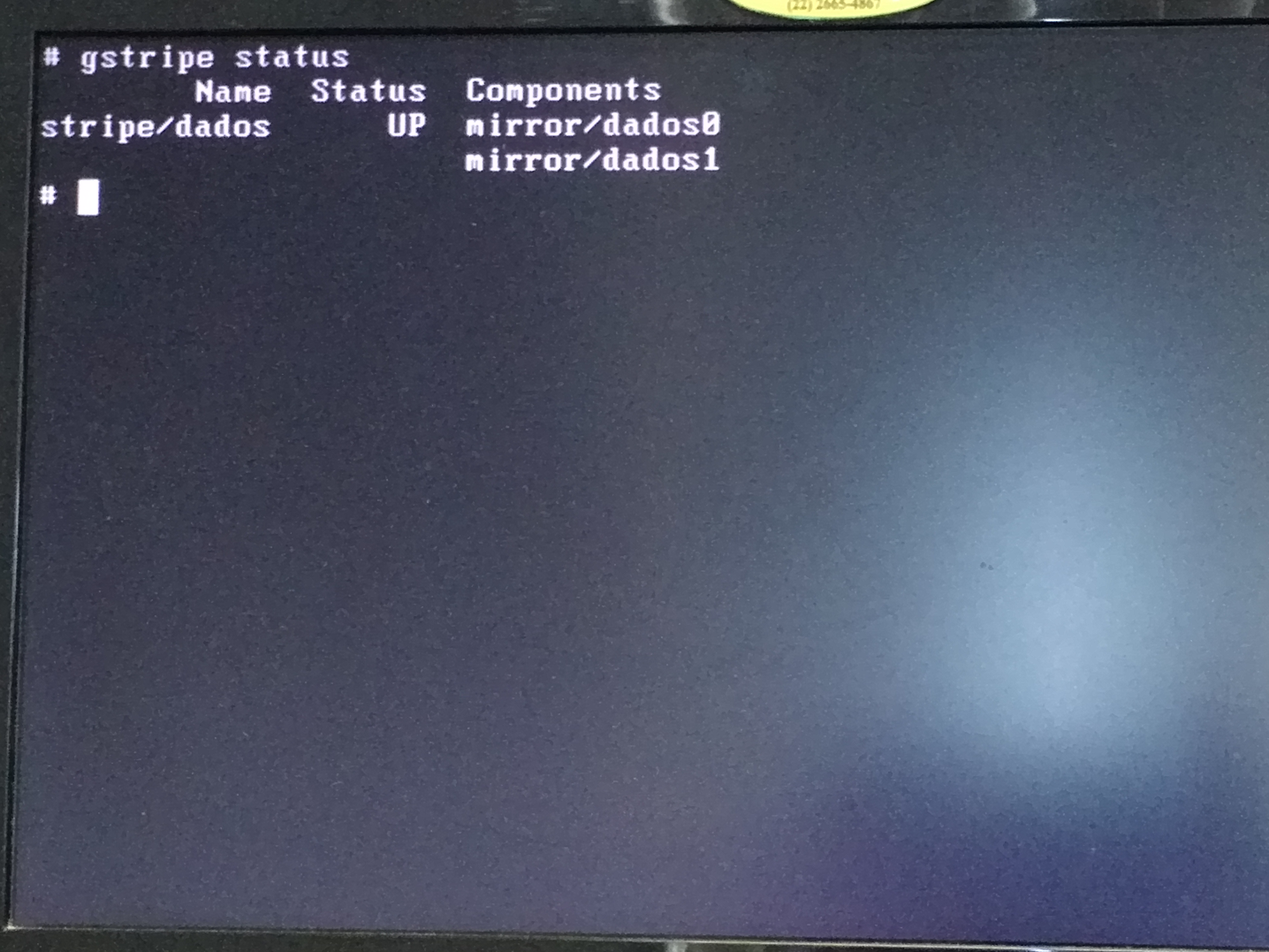 # gstripe label -h dados /dev/mirror/dados0 /dev/mirror/dados1 Nesse ponto teremos um device /dev/stripe/dados com aproximadamente 3.5Tb que usaremos pra armazenar nosso backup. :) # gstripe status
